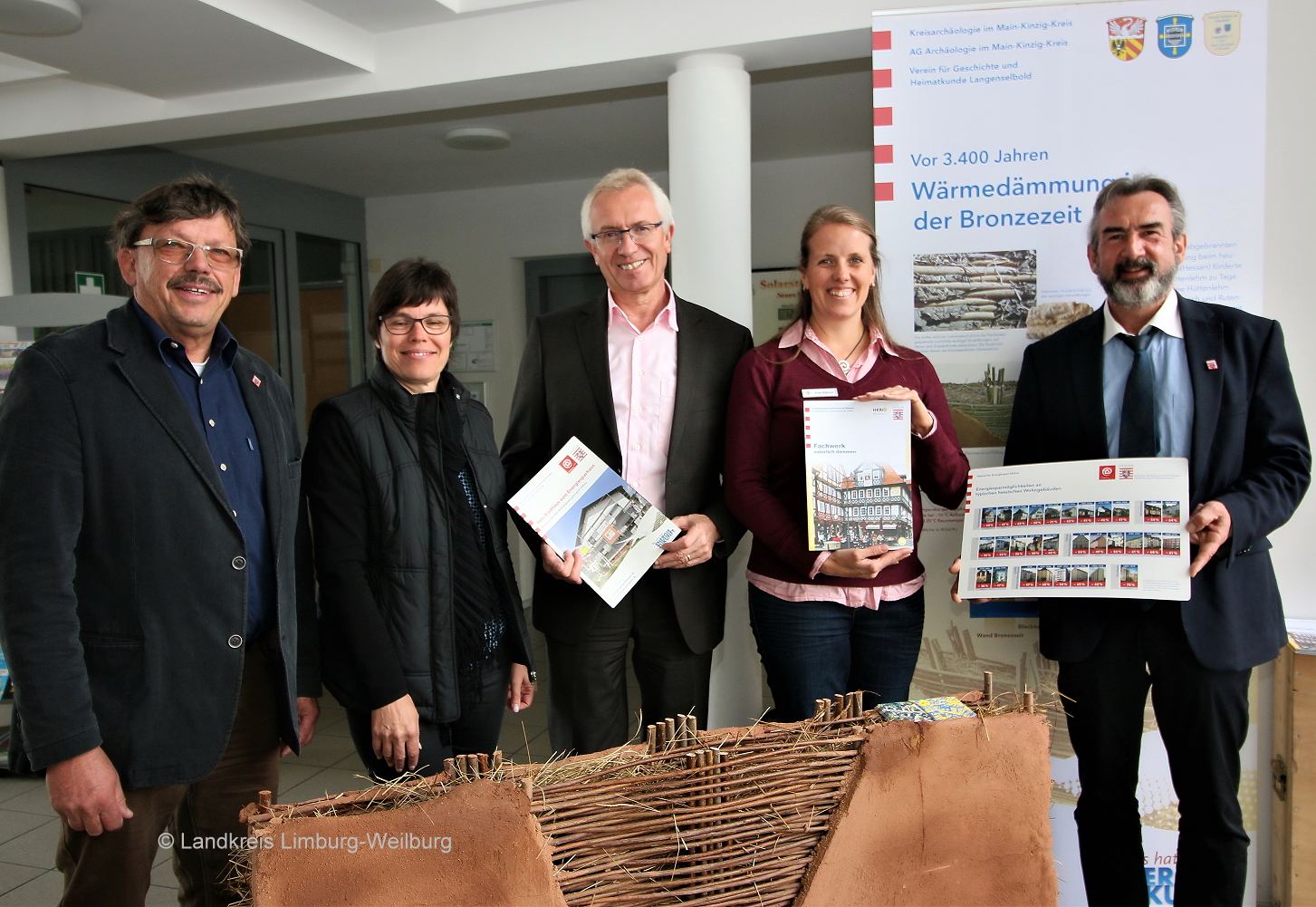 Jürgen Kotz von der Hessischen Energiespar-Aktion, Alexandra Blättel und Bürgermeister Horst Kaiser von der Gemeinde Elz, Landkreis-Klimaschutzmanagerin Verena Nijssen und Klaus Fey von der Hessischen Energiespar-Aktion (von links) freuen sich über die Ausstellung.